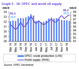 Предварительные данные сигнализируют, что в феврале 2018 года мировое предложение выросло на 0.37 мб/день до 98.29 мб/день, по сравнению с прошлым месяцем. Предварительные февральские данные показывают рост предложения от стран вне ОПЕК (включая газоконденсатные жидкости ОПЕК) на 0.45 мб/день до 66.01 мб/день. Это на 1.71 мб/день выше, по сравнению с прошлым годом.