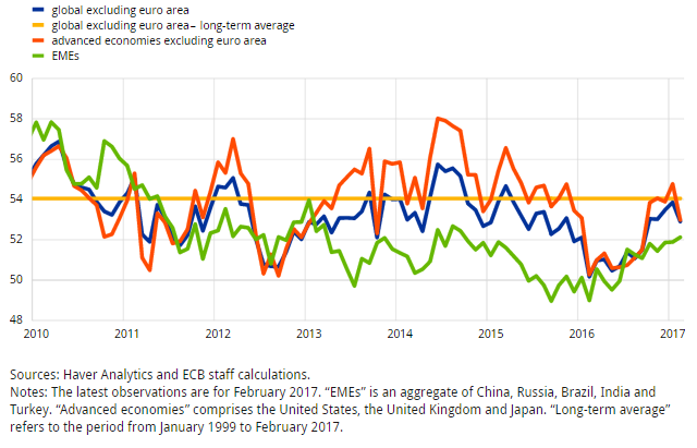 Ожидается, что глобальный рост будет небольшим, но устойчивым. Недавние публикации данных подтверждают улучшение глобальной экономической активности во второй половине 2016 года и указывают на устойчивый рост в начале 2017 года. Ожидается, что и страны с развитой экономикой, и страны с формирующимся рынком (Emerging Market Economies — EME) будут поддерживать этот рост. В частности, ожидается, что стимулирование налогово-бюджетной политики укрепит активность в Соединенных Штатах, в то время как постепенное ослабление глубокой рецессии в некоторых крупных экспортерах сырьевых товаров будет способствовать росту в развивающихся странах. Вместе с тем неопределенность по-прежнему возрастает в силу ряда факторов, включая новую политику администрации США и ее воздействия на экономику, воздействие внешних факторов на глобальную деятельность, восстановление сырьевого экспорта, постепенное перебалансирование китайской экономики и будущие отношения между Соединенным Королевством и Европейским союзом.