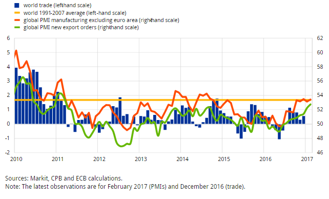 Мировая экономическая активность улучшилась во второй половине прошлого года, и ожидается, что ее рост сохранится в первом квартале 2017 года. В последние месяцы, после восстановления цен на нефть, увеличилась мировая инфляция. Ожидается, что медленный темп уменьшения свободных мощностей в среднесрочной перспективе окажет некоторую поддержку в борьбе с инфляцией.