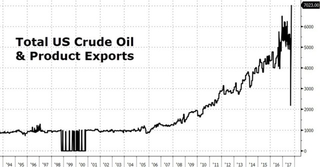 Экспорт сырой нефти из США вырос почти до 2 млн баррелей в сутки, что является новый рекордом для Америки. Общий же объем экспорта сырой нефти и нефтепродуктов из США вырос за минувшую неделю более чем до 7 млн баррелей в день, что на 1 млн баррелей в день выше, чем на предыдущей неделе, и, конечно же, также является абсолютным рекордным.