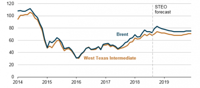 Управление энергетической информации прогнозирует, что цена на West Texas Intermediate (WTI) будет расти несколько медленнее. Спред между Brent и WTI расширится в октябре до $9 за баррель. Однако, к декабрю 2019 года спред между Brent и WTI сузится до $4 за баррель.