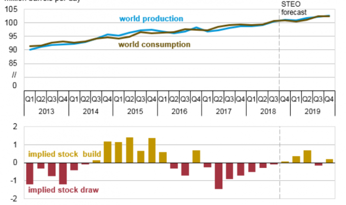 EIA прогнозирует, что объемы нефтедобычи в США в 2019 году увеличатся на 1.0 млн. баррелей в день.