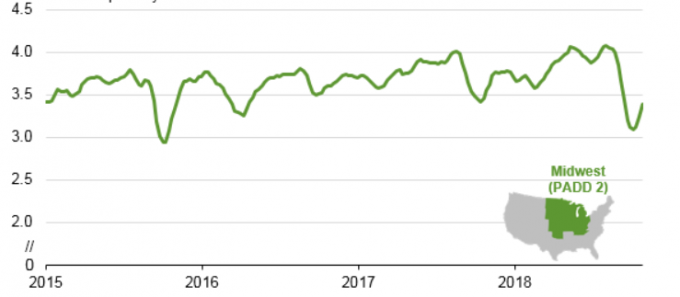Несколько месяцев подряд активность по нефтепереработке в регионе Midwest (именуемом также Petroleum Administration for Defense District 2) находилась на рекордно низком уровне. В течение четырех недель, предшествующих 26 октября, средний объем нефтепереработки составил 3.1 млн. баррелей в день. Это минимальное четырехнедельное значение с 2015 года, указывает Управление энергетической информации (EIA) в своем отчете Weekly Petroleum Status Report.