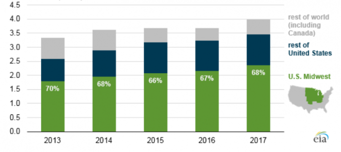 Нефтепереработчики из Midwest перерабатывают большую часть поставляемой из Канады в США нефти. В 2017 году НПЗ региона Midwest перерабатывали 2.4 млн. баррелей канадской нефти в день. Это 68% от общего объема импорта Штатами нефти из Канады и около 60% от среднего объема нефтедобычи в Канаде.