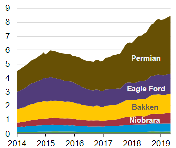 В феврале 2019 года объемы нефтедобычи в семи проанализированных регионах, где располагаются сланцевые нефтяные и газовые месторождения, составили 8.2 млн. баррелей в день, а объемы добычи природного газа — 77.1 млрд. кубических футов в день (природный газ). Это 70% от общего уровня нефтедобычи и 71% от общего уровня добычи природного газа в США.