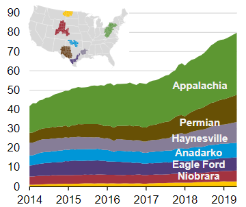 В отличие от нефтяных регионов, в газовых регионах, таких как Appalachian и Haynesville, число пробуренных, но не освоенных скважин за последние три года сократилось почти вдвое с 1,230 единиц в марте 2016 года до 713 единиц в марте 2019 года.