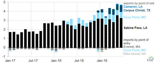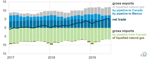 EIA ожидает, что США и в дальнейшем продолжат экспортировать больше газа, чем импортировать. В 2019 году чистый экспорт природного газа в США составит 4.6 млрд. кубических футов в день, а в 2020 году — 7.2 млрд. кубических футов в день.