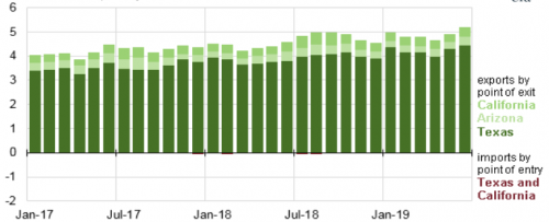 Рис. 4 Объемы торговли природным газом по трубопроводам между США и Мексикой (январь 2017 — июнь 2019), млрд. кубических футов в день