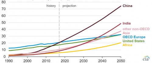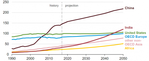 Прогнозируется, что к 2050 году Индия будет потреблять больше энергии, чем США в 2040-ых. Вместе с тем, лидером по спросу на энергию к 2050 году станет Китай.