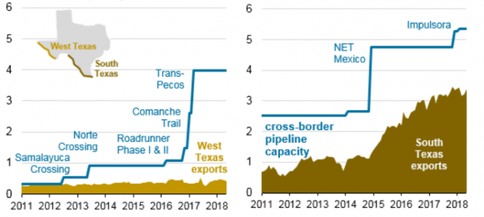 В 2017 году экспорт природного газа по трубопроводам составил 4.2 млрд. кубических футов в день. В течение первых пяти месяцев 2018 года данный показатель возрос до 4.4 млрд. кубических футов в день. Согласно данным компании Genscape, в июле экспорт природного газа в Мексику по трубопроводам впервые превысил показатель 5 млрд. кубических футов в день.