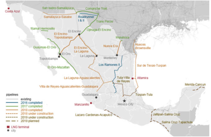 В начале 2018 года несколько ключевых трубопроводов в Мексике все-таки были запущены. Ожидается, что в ноябре 2018 года будут также запущены трубопроводы La Laguna-Aguascalientes (1.2 млрд. кубических футов в день) и Villa de Reyes-Aguascalientes-Guadalajara (0.9 млрд. кубических футов в день). Но сперва необходимо дождаться завершения строительства связующего звена в El Encino-La Laguna в октябре.