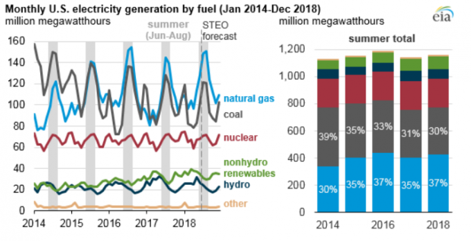 По данным Управления энергетической информации, операторы электростанций в течение первых четырех месяцев 2018 года увеличили производительность электрогенерации за счет природного газа на 5.4 гигаватт. К концу года данный показатель возрастет ещё на 15 гигаватт. Это станет крупнейшим увеличением производительности за счет использования природного газа с 2004 года.