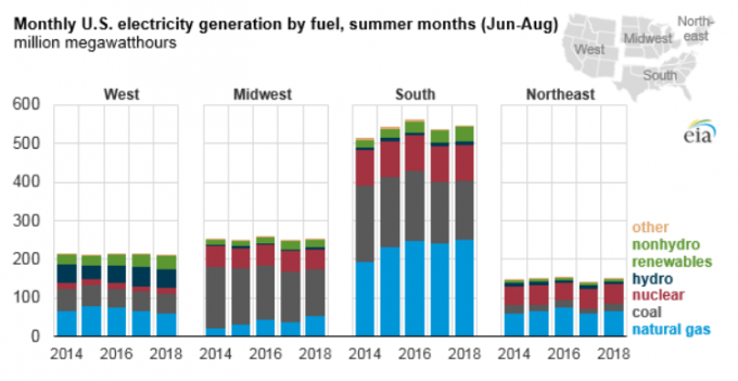 Ожидается, что летом 2018 года в регионе Midwest 20% электроэнергии будет вырабатываться за счет использования природного газа. Прошлым летом данный показатель составил 15%. Вместе с тем, доля использования угля сократится с 53% в прошлом году до 49% в этом году.