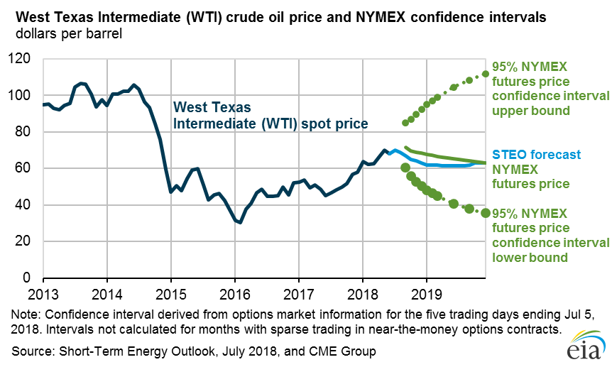 Цены на контракты по WTI на NYMEX на октябрьские поставки 2018 года, находились в диапазоне от $56/баррель до $87/баррель.