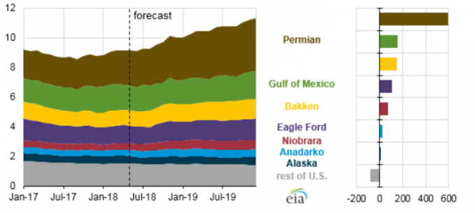 Согласно прогнозу Управления энергетической информации (EIA) “Short-Term Energy Outlook (STEO)”, объемы производства нефти в США в 2018 году составят, в среднем, 10.7 млн. баррелей в день. В 2019 году данный показатель возрастет до 11.7 млн. баррелей в день. Таким образом, оба показателя превысят рекорд 1970 года — 9.6 млн. баррелей в день. Увеличение объемов нефтедобычи почти полностью обязано развитию сланцевой промышленности. В частности, в 2019 году более чем за половину от роста объемов добычи нефти в Штатах будет ответственен регион Permian Basin на западе Техаса и востоке Нью Мексико.