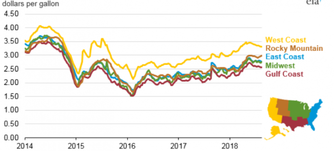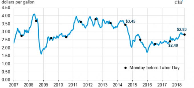 По состоянию на 27 августа 2018 года средняя розничная цена на бензин в США составила $2.83 за галлон — это рекорд с 2014 года.