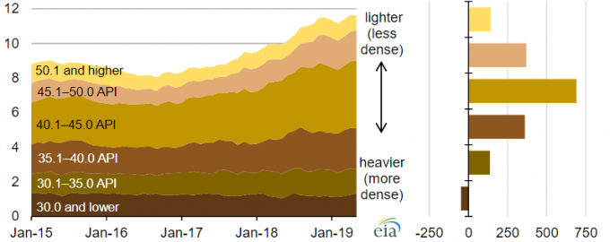 В 2018 году более 55% добываемой в США нефти характеризовалось плотностью API свыше 40 градусов. В 2015 году данная цифра составляла 50%.