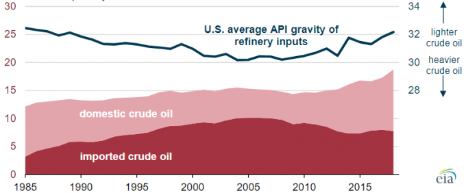 Плотность API нефти, используемой американскими НПЗ (как произведенной в США, так и импортированной из-за рубежа), в период с 2004 по 2018 годы возросла с 30.2 градусов до 32.2 градусов.