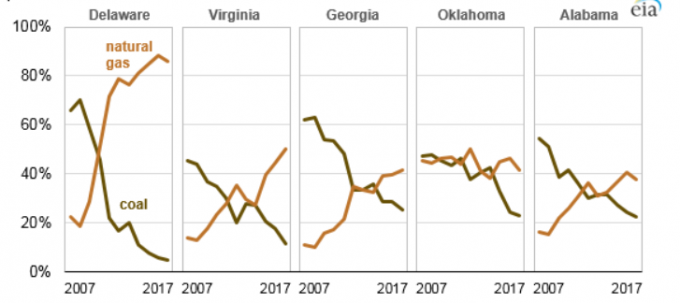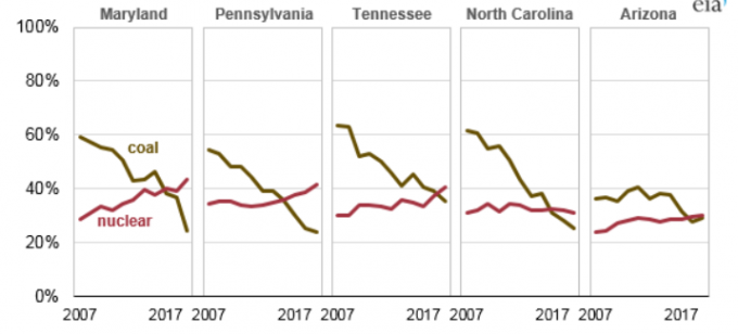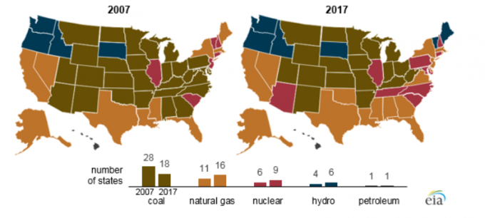 Из 10 штатов, в которых уголь в 2007 году был основным источником электрогенерации, к 2017 году 5 штатов перешли на природный газ и 5 — на атомную энергию.