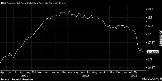 Данные дают смешанную картину. Депозиты возобновили снижение после скачка на предыдущей неделе. Они резко упали в прошлом месяце сразу после банкротства SVB и других банков, и сейчас данный показатель находится на самом низком уровне с июля 2021 года.