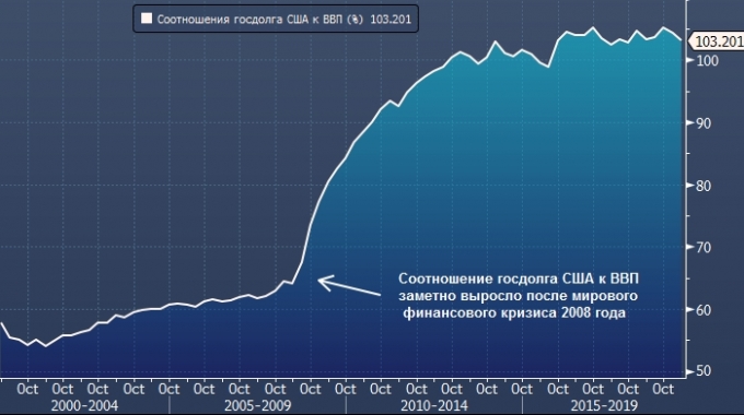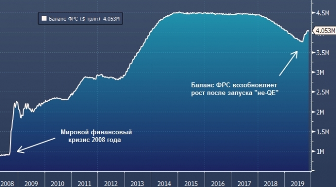 Процесс, на который ссылаются авторы доклада, идеально описывает текущую политику Федеральной резервной системы! Недавно регулятор объявил о том, что будет ежемесячно покупать векселя на $60 млрд, и эта программа продлится как минимум до второго квартала 2020 года. Благодаря этому объем госдолга США на балансе ФРС вырастет примерно на $400 млрд.