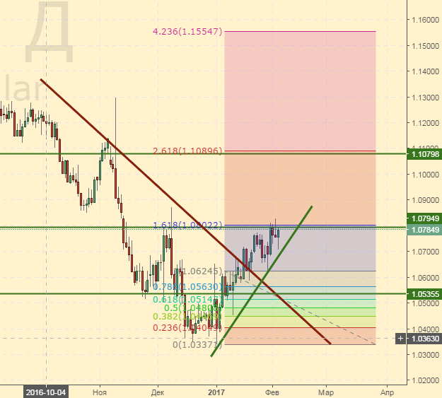 Сценарий падения: конец недели подарил возможность для тактической продажи с возможным падением к 1.0550. Для того чтобы рынок развивался однонаправленно вверх в течении целого месяца фундаментальных предпосылок не было, а по технике, как раз нужен откат. Тут есть ряд сомнений из-за длинных теней в обе стороны, поэтому продажи лучше проводить на часовках, под строгим контролем.