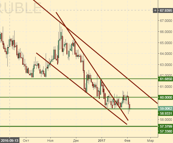 Сценарий роста: прокололи вниз 59.00. Видно, что можем уйти на 57.30. Пока не покупаем. Кто просто в долларах сидит – сидите. Пока не видно за счет чего будем среднесрочно улучшать торговый баланс и пополнять бюджет. Нам нужен взрывной рост налогооблагаемой базы за счет создания новых производств и лоббирования собственных интересов, путем заградительных пошлин. Новые экономические инициативы, а не унылое блеяние про стоимость нефти к эйфории не приводит. Кроме того, покупки валюты с рынка не дадут сильно укрепиться рублю.
