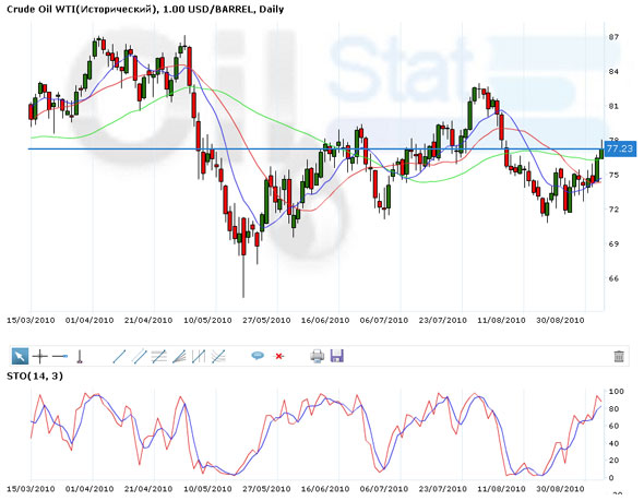 Вчера нефть марки WTI закрылась вверху, продолжив подъем от августовских минимумов. Фиксация прибыли умерила рост, а закрытие в средней части дневного торгового диапазона предполагает обычное открытие во вторник. Стохастический индикатор направлен вверх, сообщая о том, что в ближайшее время возможно дальнейшее повышение цен. Если октябрьские фьючерсы на нефть будут и дальше подниматься, то следующей целью покупателей станет уровень восстановления в 62% после августовского падения — $78,58 за баррель. Закрытия ниже двадцатидневной скользящей средне $74,43 за баррель должны снизить позитивные настроения на рынке. Ближайшее сопротивление – $78,04 за баррель. Следующее сопротивление – $78,85 за баррель. Ближайшая поддержка -$74,43 за баррель. Следующая поддержка – $70,76 за баррель.