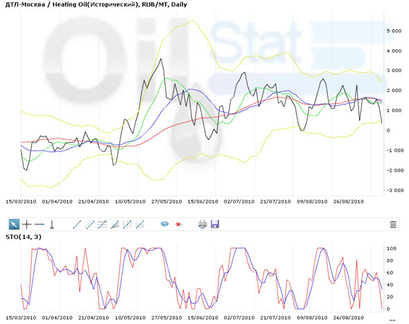 Сегодня арбитраж между ДТЛ на базисе «Москва» и Heating oil на ICE составляет порядка 324,21 руб. за тонну, пробив линию поддержки в 356,8 руб. за тонну. Линия сопротивления составляет 450,13. Стохастический индикатор K равен 0%, предполагая, что в скором времени будет разворот, и разница вновь увеличится. Во вторник на ЭТП eOil.ru общий объем лотов на продажу увеличился на 13,65% до 1,017 млн руб, общий объем лотов на покупку, напротив, упал на 2,89% до отметки в 218 млн руб.