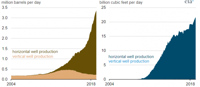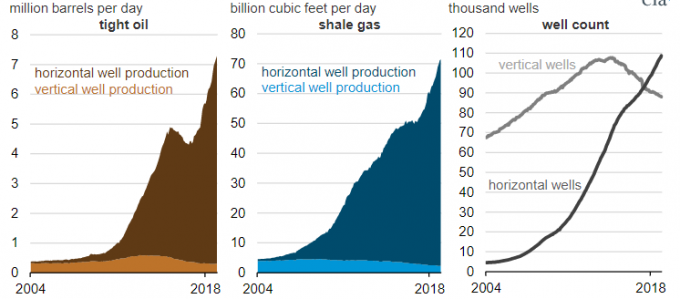 По состоянию на конец 2018 года на сланцевых месторождениях в США по-прежнему работали 88,000 вертикальных скважин. Но объемы нефти и природного газа, добываемых с использованием этих скважин, невелики по сравнению с объемами ресурсов, добываемых из горизонтальных скважин.
