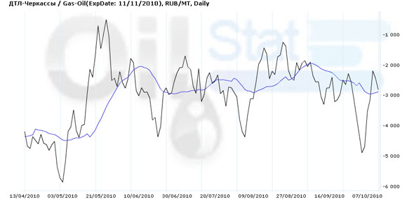 Арбитраж между ДТЛ на базисе «Черкассы» и Gas-Oil на ICE увеличился до -2 823,02 руб. за тонну. Произошло это вследствие того, что в России спрос на «лето» падает в связи с похолоданием, но в Европе еще активно используют Gas-Oil. Кроме того, котировки Gas-Oil тесно связаны с ценою на нефть, которая последние дни находится на отметке выше $80 за баррель.