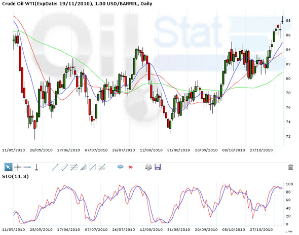 Днем ранее рост цен на нефть прекратился в связи с укреплением американского доллара. В итоге под конец торгового дня цена на нефть практически не изменилась. Стоимость декабрьского фьючерса на нефть марки WTI немного снизилась до уровня $87,81 за баррель, а контракт на нефть марки Brent с поставкой в декабре закрылся также слабым снижением на $0,15 до отметки $88,81 за баррель.