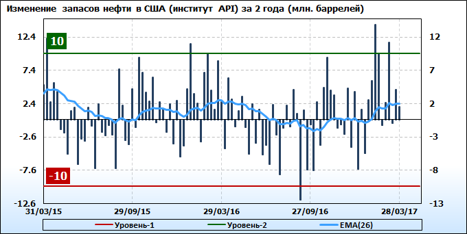 Изменение запасов нефти в США (институт API). Данные на 28.03.2017