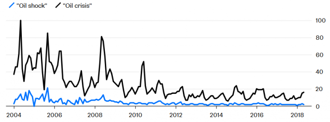 Если судить по статистике поисковых запросов в Интернете, то нефтяной шок — это последнее, о чем люди сейчас беспокоятся. И действительно, может показаться безумием впадать в панику, когда Brent пробивается через $80, а West Texas Intermediate торгуется в районе $70. Это примерно на треть меньше, чем четыре года назад. Но у нефти короткая память.