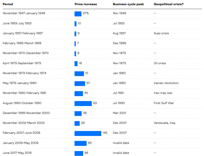 Возьмем, например, первую войну в Персидском заливе. За пять месяцев между вторжением Саддама Хуссейна в Кувейт в 1990 г. и началом операции Пустынный шторм, произошел скачок цен на West Texas Intermediate до $30.84 за баррель.