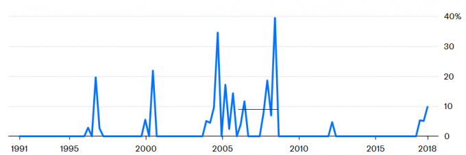 Рис. 1 Беспокойства нет. Данные по поисковым запросам термина “нефтяной шок” показывают, что мир не слишком обеспокоен ценами на нефть (источник — Google Trends)