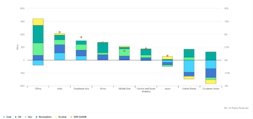 Рис. 3 Изменения спроса на энергию по видам топлива и регионам согласно Stated Policies Scenario, 2019-2030 годы