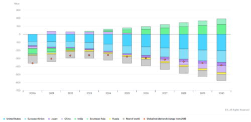 Рис. 4 Изменение спроса на уголь по регионам согласно Stated Policies Scenario, 2020-2030 годы