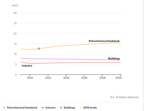 За последнее десятилетие транспортная сфера была ответственна за 60% от роста спроса на нефть. В следующем десятилетии 60% роста спроса на нефть придется на нефтехимическую промышленность. Это обусловлено ростом спроса на пластик, в особенности для упаковочных материалов.