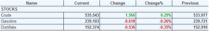 Коммерческие запасы нефти в США выросли на 1.566 до 535.543 млн. баррелей. Запасы бензина упали на -0.618 до 239.103 млн. баррелей. Запасы дистиллятов упали на -0.536 до 152.374 млн. баррелей.
