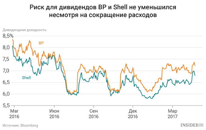 По мнению аналитика Citigroup Алистер Сайма, понизившего рейтинг Shell и BP в середине апреля, компаниям необходимо, чтобы цены на нефть продолжили рост. По его словам, они не смогли адекватно решить проблему высоких дивидендов, даже предлагая акционерам акции вместо наличных денег и существенно сокращая расходы. Дивидендная доходность в Shell и BP, упавшая в 2016-м, вновь выросла в этом году. Ранее исполнительный директор Shell Бен ван Берден говорил агентству, что свободный денежный поток компании в IV квартале был больше, чем дивиденды.