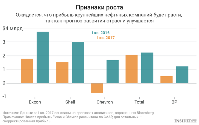 Чистая прибыль пяти компаний в I квартале увеличится более чем в 2 раза, считают аналитики, опрошенные Bloomberg. Chevron вернется к прибыли, а доходы Shell вырастут до максимума семи кварталов. Exxon, Total и BP могут получить максимальную прибыль с с сентября 2015-го. «Цены на нефть играют существенную роль, но кроме того компании помогают себе, снижая операционные расходы. Текущий уровень цен позволяет большинству компаний платить дивиденды», — говорит аналитик Jefferies International Джейсон Гаммел.