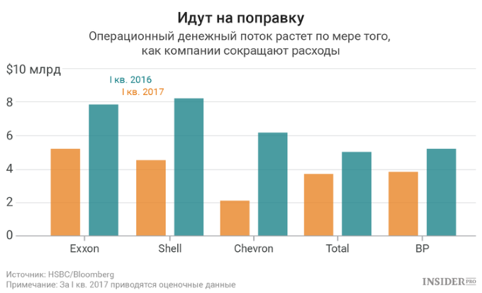 Борьба крупнейших нефтяных компаний с последствиями обвала цен на нефть приносит плоды, у некоторых из них уже достаточно денег, чтобы выплатить дивиденды, не залезая в долги. Пять крупнейших в мире негосударственных нефтедобывающих компаний в IV квартале 2016 года увеличили денежные поступления от операционной деятельности на 67%, следует из данных аналитиков HSBC.