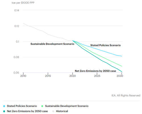 Рис. 3 Энергоемкость согласно сценариям WEO 2020 в период с 2010 по 2030 годы