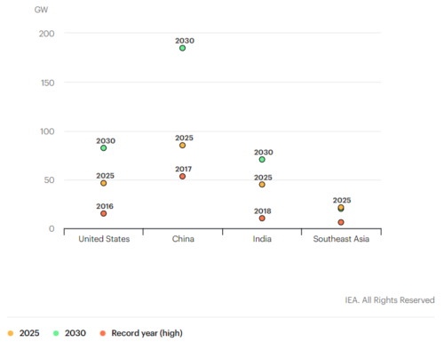 Рис. 6 Рост объемов энергии, производимой на солнечных фермах по странам, 2025 и 2030 годы