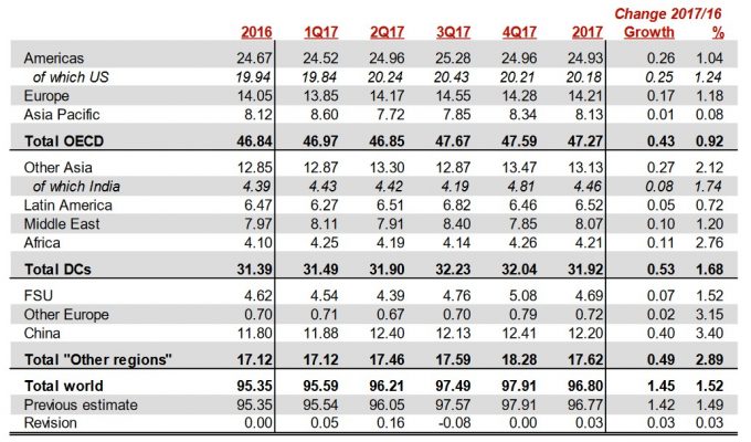Прогноз мирового спроса на нефть в 2017 году был пересмотрен по сравнению с предшествующим месяцем в сторону увеличения на 30 tb/d. Это связано с увеличением прогнозов для стран ОЭСР и Китая. Показатель роста спроса составляет 1.45 mb/d. Общий показатель спроса — 96.80 mb/d.