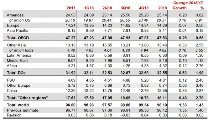 Показатель роста спроса в 2018 году был пересмотрен в сторону повышения на 30 tb/d по сравнению с предыдущим отчетом. В настоящий момент в 2018 году ожидается рост спроса на 1.38 mb/d. Общий показатель потребления нефти в 2018 году составит 98.19 mb/d.