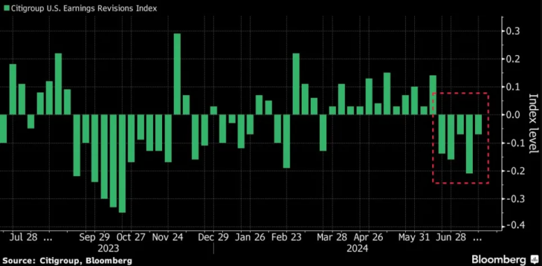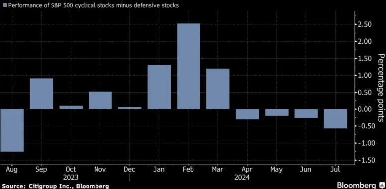 Корзина акций Citigroup Inc. показывает, что с конца июня число понижений рейтингов по прибыли значительно превысило число повышений. Между тем, циклические акции в S&P 500 с апреля демонстрируют более низкие показатели, чем относительно безопасные защитные акции.
