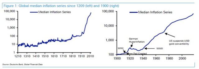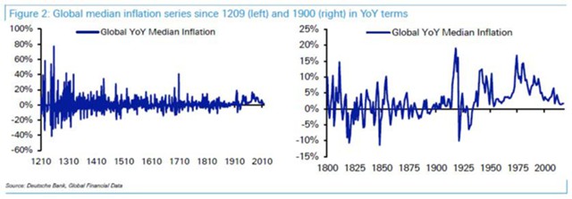 За предыдущее столетие или около того эти системы периодически рушились во многих странах на фоне войн и особенно во время Великой депрессии 1930-х гг. Тем не менее страны, как правило, возвращались к некоему подобию привязки к драгметаллу после высокой инфляции. На рисунке 1 отражен глобальный средний показатель инфляции за 800 лет, а затем выделяется период после 1900 г., когда инфляция выросла относительно долгосрочного периода в истории.