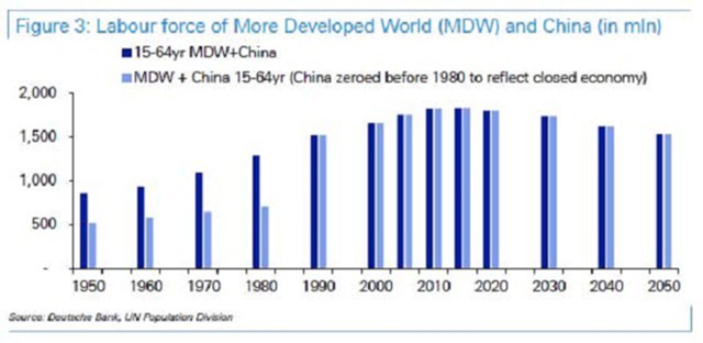 Эффективная мировая рабочая сила начала расти примерно с 1980 г. благодаря естественной глобальной демографии и Китаю, открывшему свою экономику для внешнего мира в конце 1970-х гг. На рисунке 3 показана ситуация в отношении граждан трудоспособного возраста от 15 лет до 64 лет в более развитых регионах и в Китае, где во второй колонке показана ситуация с Китаем до 1980 г., чтобы отразить его практически закрытую экономику до этого момента и эффективный всплеск глобального предложения рабочей силы после этого. Влияние этого впервые было отражено в 1990 г., и это отражено на графике.